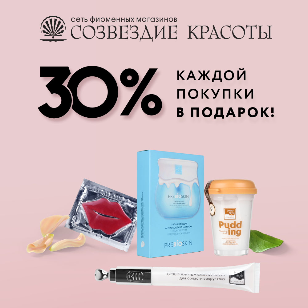 Какие подарки считаются самыми ценными? Те, которые нам дарят «просто так», верно? Что уж скрывать – мы вас любим, поэтому в очередной раз не смогли устоять перед соблазном придумать еще какую-нибудь акцию. Без повода. Просто, чтобы ваши глаза загорелись от счастья. 30% от стоимости каждой покупки в подарок! Делайте покупки в "Созвездии красоты" – дополнительно выбирайте лучшие экспресс-маски Beauty Style для лица и губ на сумму, эквивалентную 30% стоимости чека. В числе подарков – бомбические кремы с массажными насадками: антицеллюлитный моделирующий Body Sculptor и омолаживающий для глаз против отеков и темных кругов!