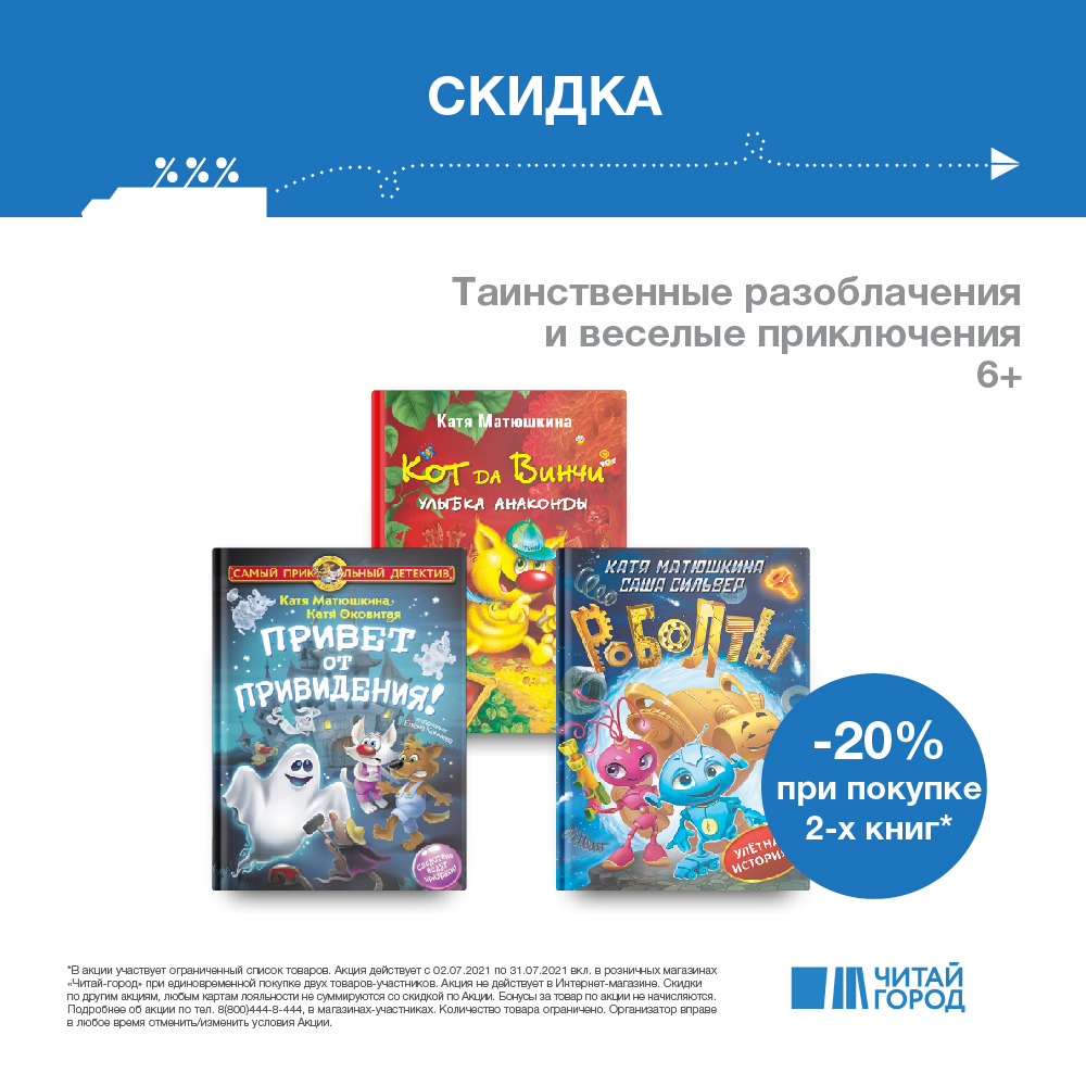 Хотите попасть в волшебный мир фей, Влипсиков и котов-сыщиков? Ваш билет – книги детской писательницы Екатерины Матюшкиной. Приходите в "Читай-город" и выбирайте удивительные истории и отправляйтесь за приключениями вместе с ребёнком :) Подробнее об акции читайте на сайте "Читай-город" или уточняйте у продавцов-консультантов. Акция действует с 2 по 31 июля.