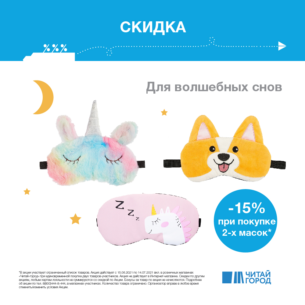 С 15 июня по 14 июля в магазине "Читай-город" проходит акция: при покупке двух масок для сна действует скидка 15%. Это отличная возможно выбрать маску для летнего путешествия – себе и другу :) Подробнее о правилах проведения акции можно узнать по ссылке. Подробности уточняйте у продавцов-консультантов.