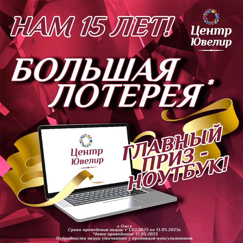 С 1 февраля по 13 мая совершайте покупки в ювелирном магазине «Центр Ювелир» и участвуйте в Большой Лотерее*. Главный приз — ноутбук!