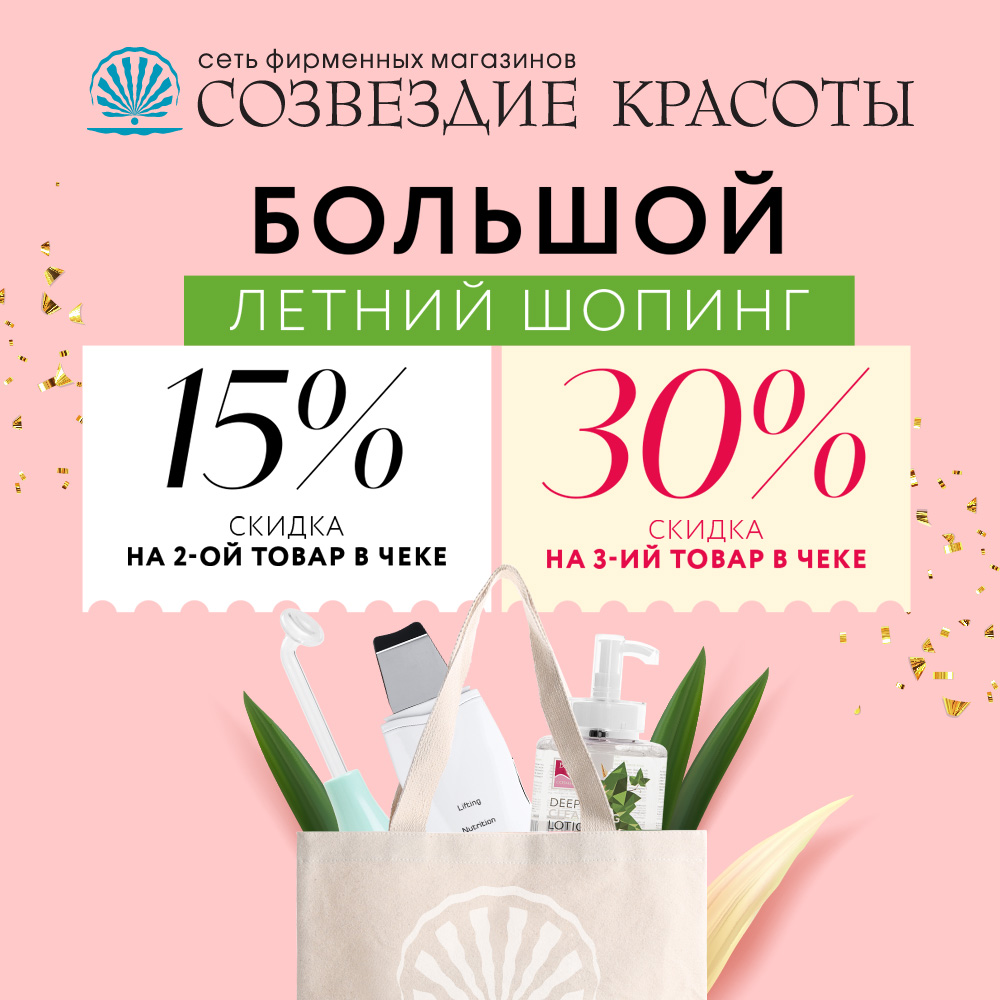 "Созвездие Красоты" дарит скидки 15% на второй товар и 30% на третий товар в чеке. Количество покупок не ограниченно! Предложение действует с 01 по 14 июля 2021 года при покупке товаров т.м. Gezatone, Beauty Style, Slendertone, MEOLI, Kativa, CRATEX. Скидки распространяются на наименьшие по стоимости товары в чеке вне зависимости от их общего количества. При участии в акции возможно только начисление бонусов на карту лояльности. *Подробности уточняйте у продавцов консультантов