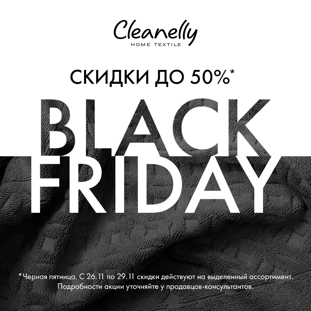 В фирменном магазине Cleanelly началась «Черная пятница»! Приглашаем вас с 26 по 29 ноября воспользоваться скидкой до 50% на любимый текстиль*. Побалуйте себя пушистыми халатами, нежными полотенцами и мягкими покрывалами, насладитесь комфортом пледов и постельного белья! Ваши вечера станут уютнее в компании с Cleanelly!