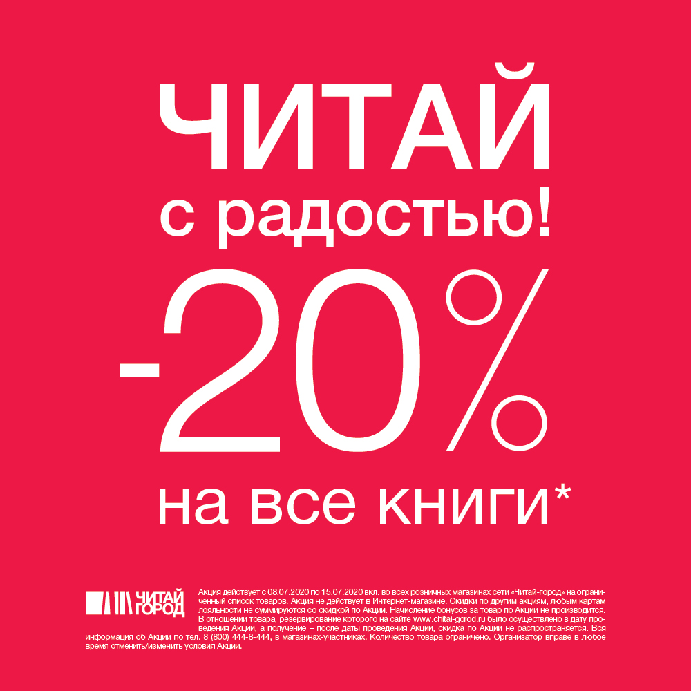 Когда книголюб чувствует себя по-настоящему счастливым? Когда выходит из любимого магазина со стопкой новых книг. Если вам нужен повод, чтобы устроить себе такой праздник, то вот он: скидка 20% на все книги в магазине "Читай-город". Побалуйте себя или сделайте приятный сюрприз близким, а лучше – и то, и другое. И пусть чтение принесёт вам радость!