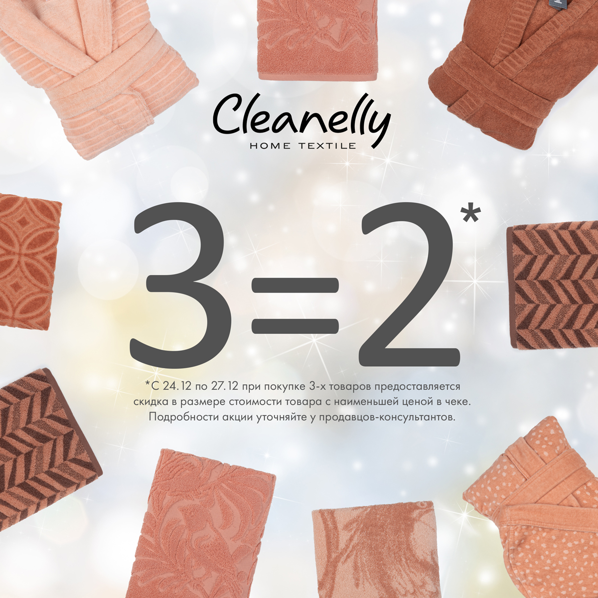 В фирменном магазине Cleanelly началась акция «3=2»! Участвуют все товары*. С 24 по 27 декабря выбирайте три изделия, а платите всего за два!** Новогодние праздники – отличный повод порадовать себя и близких качественным домашним текстилем! Кто не успел купить подарки, поторопитесь! Количество товаров ограничено.