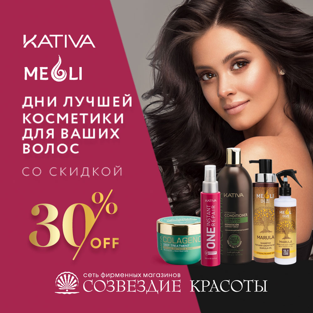 Все еще считаете, что красота волос не зависит от ухода? Много лет пользуетесь любимым шампунем или покупаете в супермаркете первое, что попалось в руки? Или никак не можете подобрать «свои» средства? Столько вопросов – один ответ! Лучшие бессульфатные шампуни, бальзамы, маски и спреи с насыщенными формулами для полноценного увлажнения и питания. Блестящие, упругие, эластичные, густые, без перхоти и расщепленных кончиков – такими могут быть ВАШИ волосы. Скидка 30% на косметику MEOLI И KATIVA – бренды №1 для красоты ваших волос в ассортименте магазина "Созвездие красоты". Попробуйте прямо сейчас, пока актуальны специальные цены! MEOLI – корейская косметика для волос на основе масла марулы, которое по своему составу легко обходит другие известные масла. Плюс целый список активных компонентов для восстановления, омоложения и защиты ваших локонов. KATIVA – южноамериканские профессиональные средства, популярные во всем мире. Более 10-ти линий, разработанных для решения конкретных проблем волос. Легко выбрать то, что подойдет именно вам. Познакомьтесь заново со своими идеальными волосами!