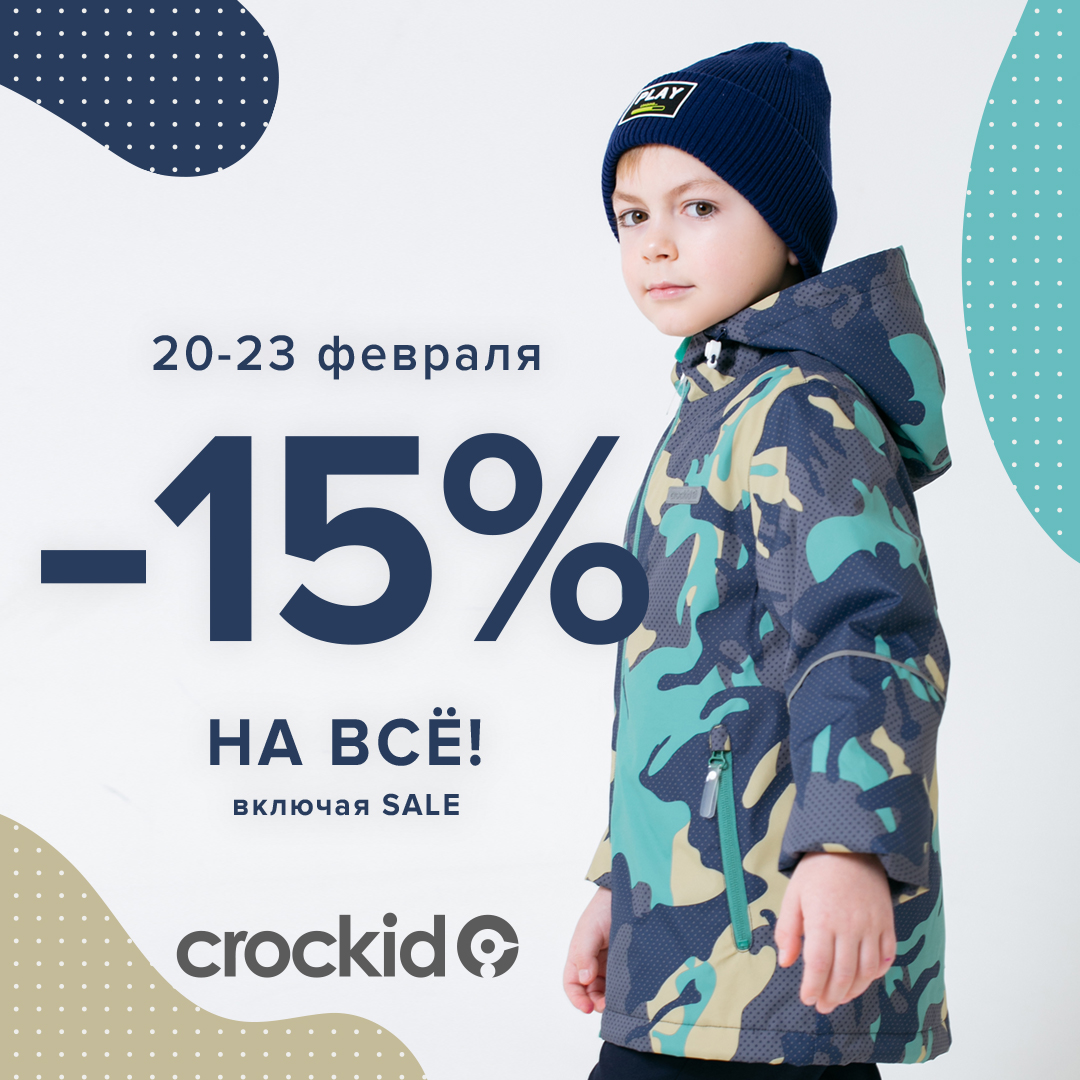 В честь праздника! Дарим дополнительную скидку 15% на все, включая SALE. Стильные комбинезоны, модные джемперы, яркие костюмы и одежда для дома – по самым выгодным ценам. Специальное предложение на коллекции прошлых сезонов – скидки до 50% и дополнительно -15% на ВСЕ! *Акция проходит в фирменном магазине CROCKID с 20.02-23.02.21 г. Подробности уточняйте у продавцов-консультантов.