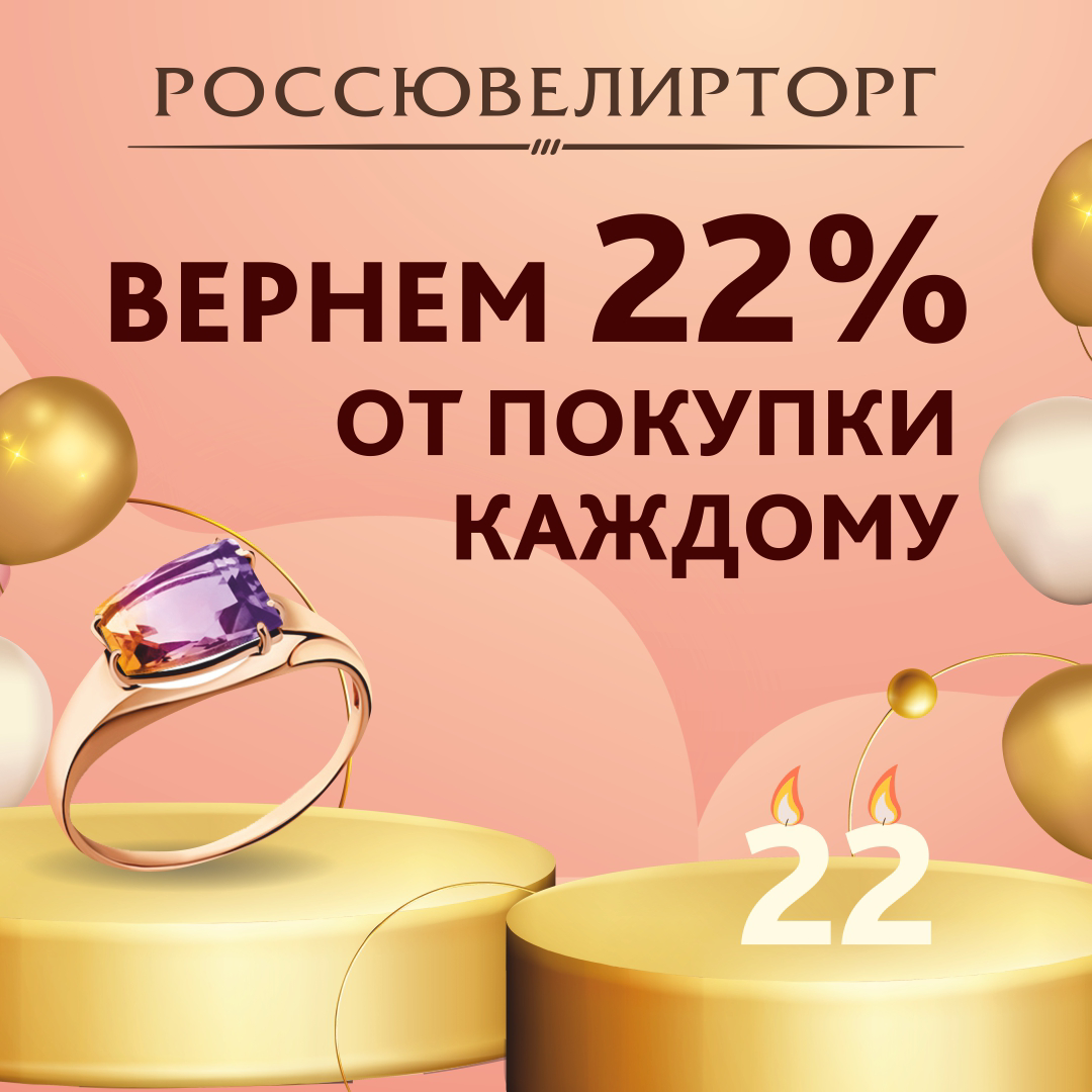 В честь своего дня рождения Россювелирторг приготовил для покупателей приятный сюрприз: всем, совершившим покупки с 8 апреля по 15 мая в салонах возвращается 22% стоимости покупки!