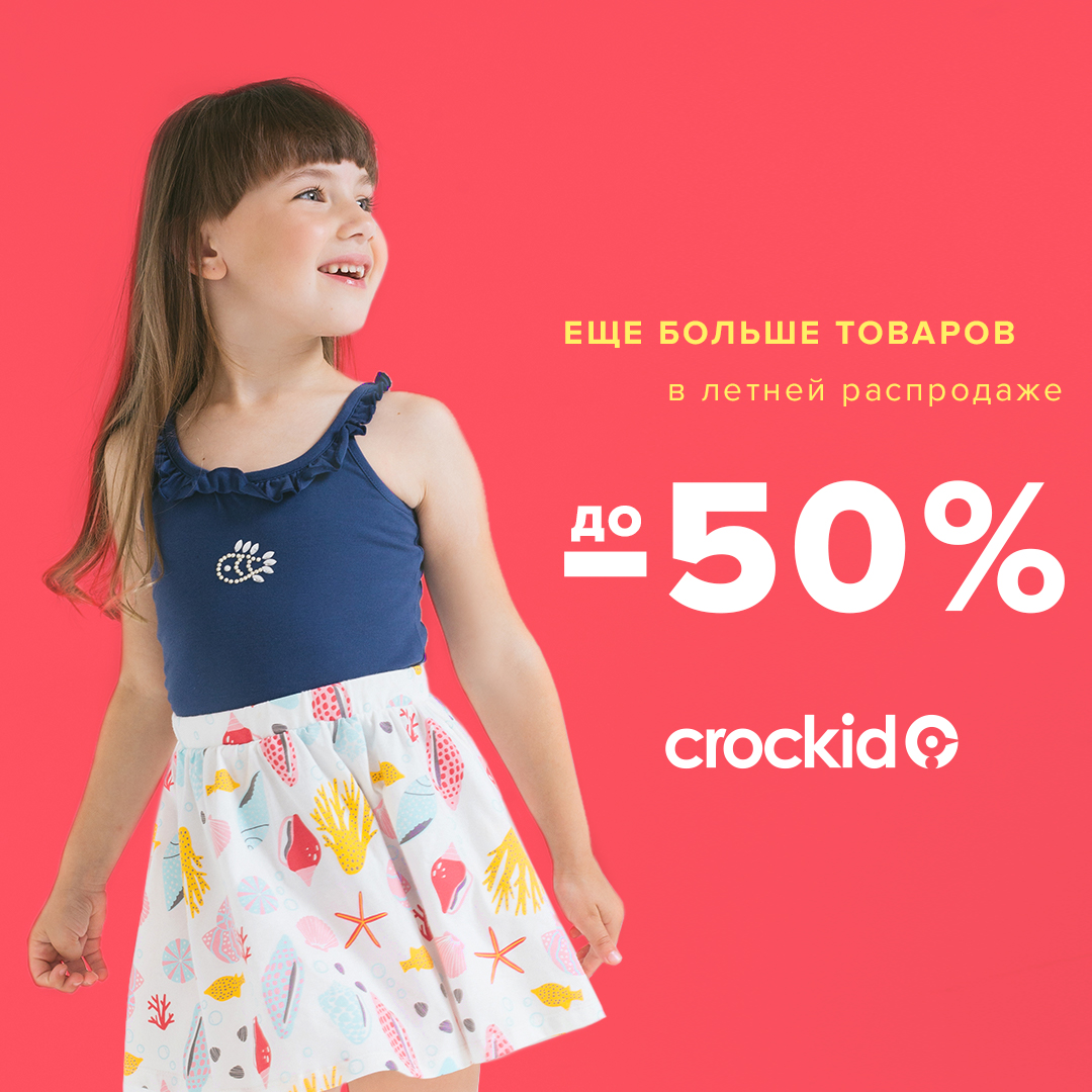 *Акция проходит в фирменном магазине до 31.08. Максимальная скидка 50% получается путем сложения текущей скидки на товар с дополнительной скидкой 20%. Дополнительная скидка действует на все, включая SALE. Кроме новых коллекций зима 20/21, белья и колготок Лето20. Подробности акции уточняйте у продавцов — консультантов Crockid.