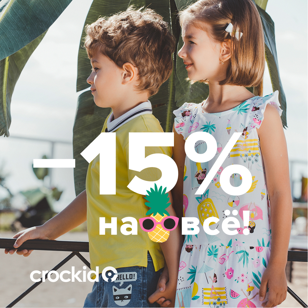 Готовьтесь к жаркому лету вместе с CROCKID! Дарим теплую скидку 15% на ВСЕ! Футболки с модными принтами, легкие платья, удобные шорты, кепки, рюкзаки и купальники – по самым выгодным ценам! Большое поступление летних коллекций из натурального органического хлопка! Акция проходит в магазине CROCKID c 1 по 10 мая 2021 г. *Подробности уточняйте у продавцов-консультантов