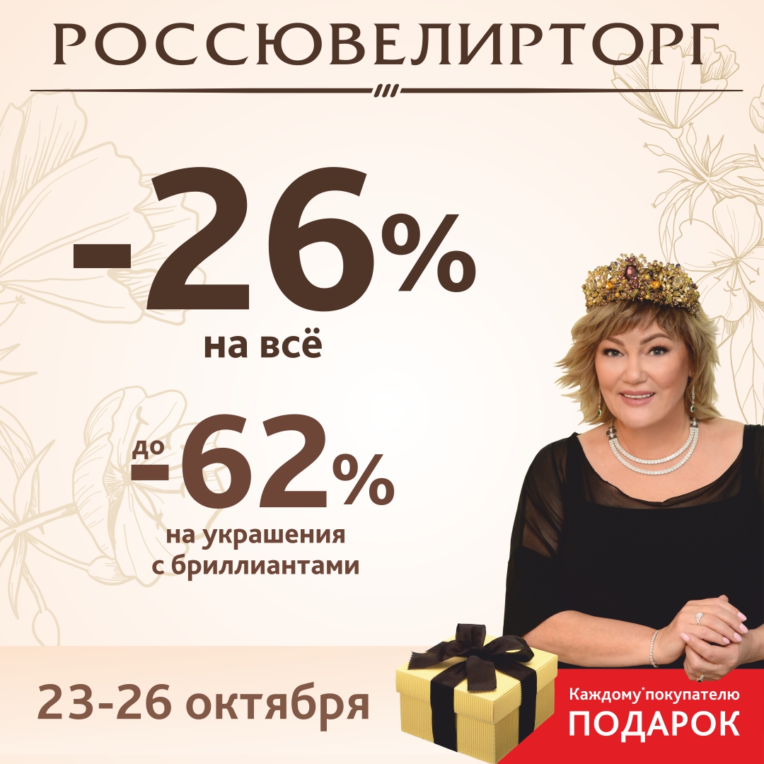 В честь Дня рождения Марины Хариби только четыре дня — 23, 24, 25 и 26 октября в салоне Россювелирторг скидка -26% на все украшения и до -62% на изделия с бриллиантами! А также при покупке от 1500 руб. в подарок выдается скретч-карта — дополнительный бонус, которым можно воспользоваться при совершении покупки в салонеРоссювелирторг в