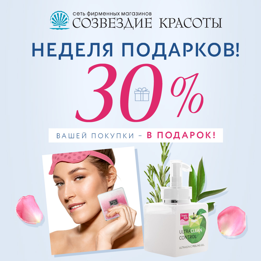 Лето мчится быстро. Не успели мы оглянуться – как уже вторая половина июня, а впереди еще столько планов! Не пропустите ни дня! Пусть ваше лето 2021 пройдет максимально продуктивно, а "Созвездие Красоты" поможет сделать его невероятно выгодным, красивым и полным сюрпризов. Счастливая неделя июня! 30% вашей покупки — В ПОДАРОК! Предложение действует с 17 по 29 июня 2021 года. *Подробности уточняйте у продавцов-консультантов.