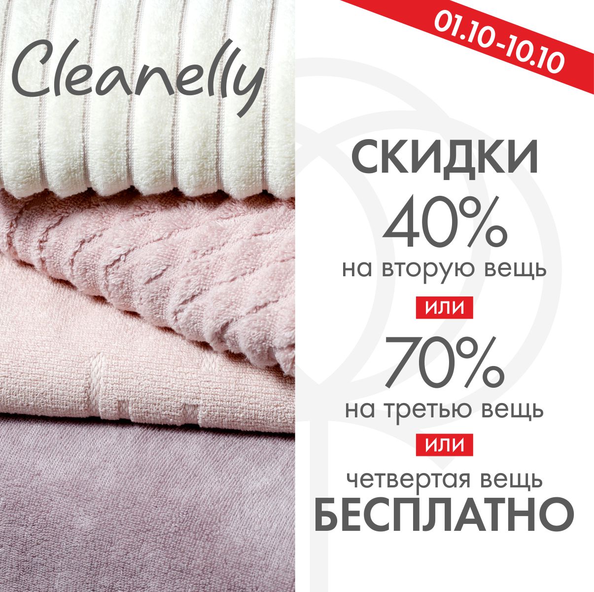 *Условия акции действительны только в магазине Cleanelly при покупке изделий из одной цветовой и детской капсул. Скидка применяется к товару, наименьшему по стоимости. Скидки по акциям не суммируются и не применяются совместно со скидкой по дисконтной карте постоянного покупателя.