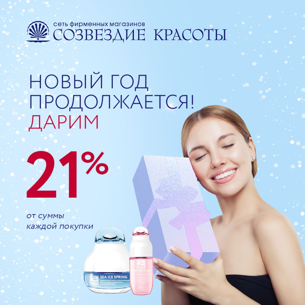 Мы прекрасно понимаем, как тяжело настраиваться на работу в первые дни года. Поэтому продлеваем праздник и продолжаем дарить подарки! Покупайте любые товары в "Созвездии красоты"– выбирайте в подарок крутую косметику BEAUTY STYLE и MEOLI на сумму 21% от стоимости покупки.