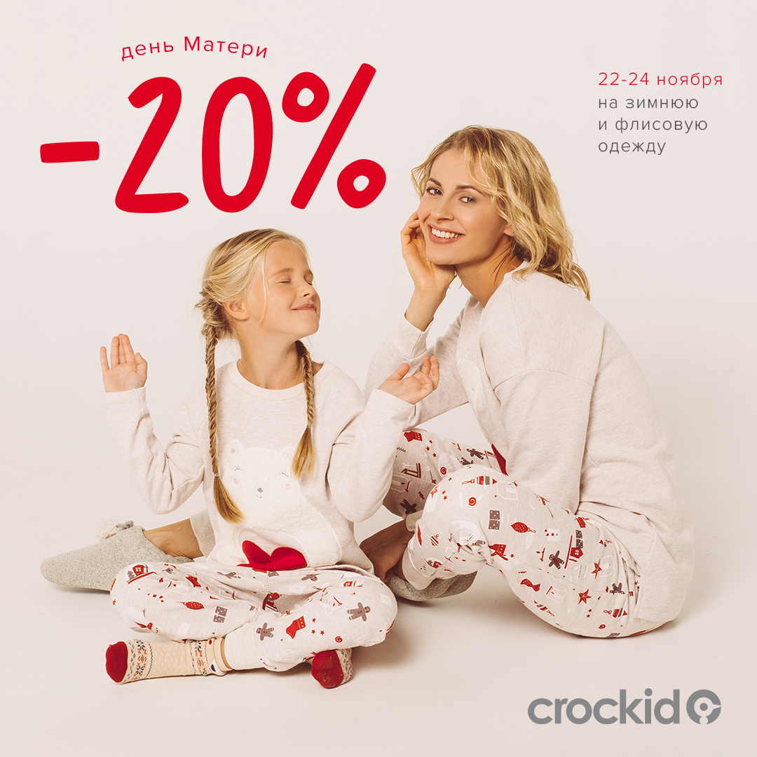 Команда CROCKID — поздравляет с праздником «День матери». И в честь праздника дарит скидку 20% на всю зимнюю одежду и флис! Пусть в вашей жизни будет больше тепла!