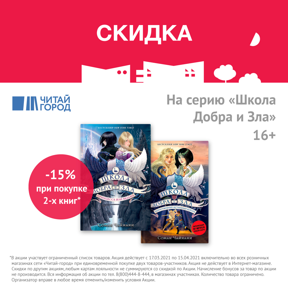 До 15 апреля в магазине "Читай-город" проходит акция на серию книг «Школа добра и зла» издательства «Эксмо». Перед Вами откроется целый сказочный мир школы Добра и зла и знакомство с главными героями – подругами Агатой и Софи, которых ждут невероятные приключения. Соберите всю коллекцию и узнайте все увлекательные детали этой истории. При покупке каждых двух книг из этой серии получаете скидку в размере 15%. Участвуют только книги серии «Школа добра и зла». Подробнее о правилах проведения можно узнать по ссылке: https://www.chitai-gorod.ru/actions/3658 или у продавцов-консультантов.