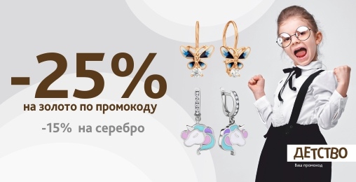 По 6 сентября по промокоду «ДЕТСТВО» на коллекцию детских украшений действует скидка -25% на золото и -15% на серебро. Порадуйте своего ребёнка! Срок действия промокода: с 21 августа по 6 сентября 2020 года. Подробности уточняйте на сайте zoloto55.ru