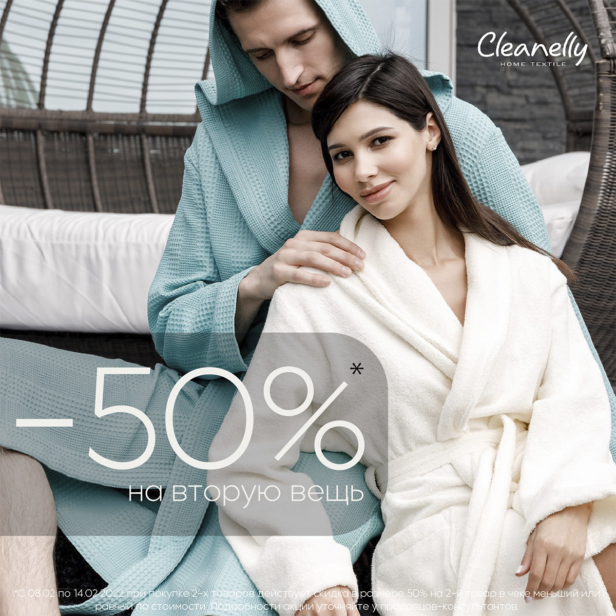 Cleanelly в честь Дня всех влюбленных дарит скидку 50% на вторую вещь*! С 08 по 14 февраля при покупке двух и более товаров, за каждый второй вы платите полцены. Халаты, полотенца, пледы, столовое и постельное белье, подушки и одеяла – желанные подарки для тех, кого любите!