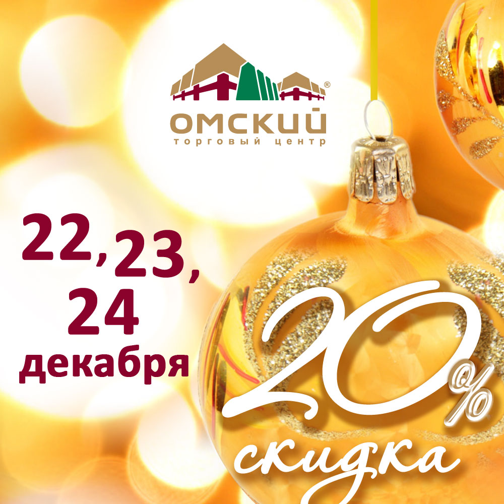 У нас появился новый повод побаловать Вас подарками! В преддверии Нового года и дня постоянного покупателя,только с 22 по 24 декабря, секции и магазины ТЦ "Омский": "Народные промыслы","Посуда","Картины", "Канцтовары", "Упаковка", "Цветы", "Чулки-носки", "Багет","Сорочки", "Галантерея", "Экспедиция", "Срочное фото", "Золото", "Часы", дарят своим покупателям скидку 20% на все товары!!!