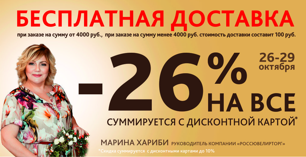 Только 4 дня с 26 по 29 октября при покупке украшений в любом салоне "Россювелирторг" скидка -26, на все!