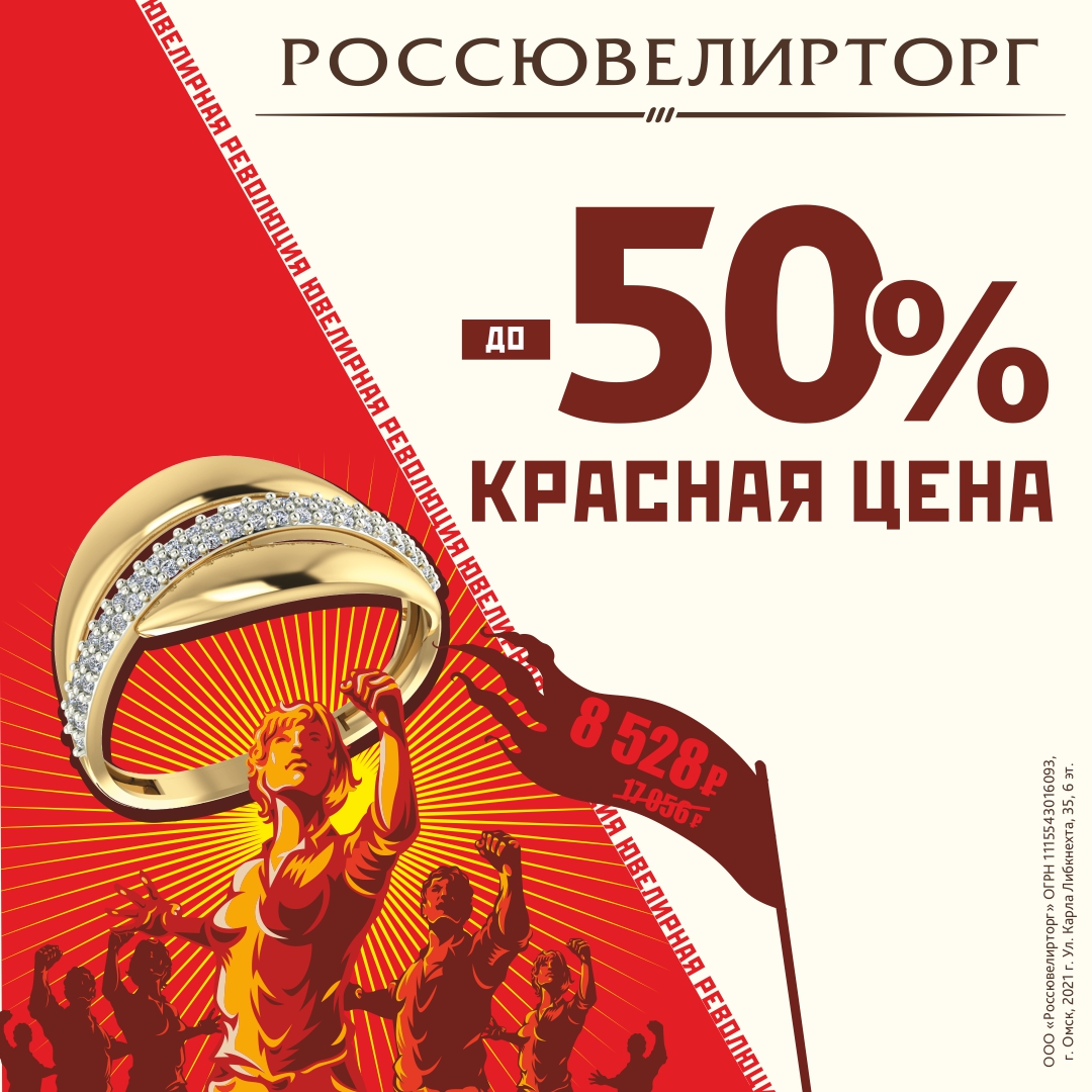 Переворот цен захватил салоны Россювелирторг: приобретайте изделия со скидкой до -50% по красным ценникам! Огромный выбор золотых и серебряных украшений с революционной скидкой ждет вас до 28 октября 2021 г.