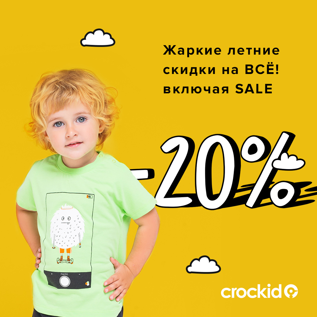 Дарим дополнительную скидку 20% на ВСЕ включая SALE! Отличный повод добавить в гардероб стильных, модных, а главное качественных вещей от Российского производителя Crockid. Летние платья, шорты, футболки, кепки, купальники, рюкзаки – все для самого жаркого и веселого лета по самым выгодным ценам!
