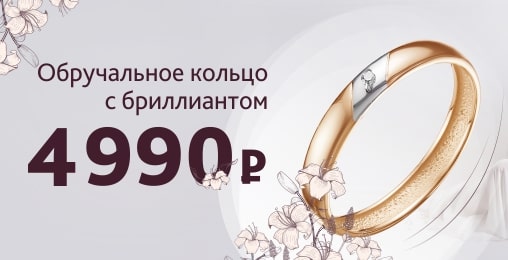 Колечко с бриллиантом — это лучший подарок девушке. А по 31 августа 2020 года в Россювелирторг обручальное кольцо с бриллиантом по специальной цене — 4990 рублей! Пусть ваша свадьба будет счастливой с кольцами от Россювелирторг! Подробности акции уточняйте у продавцов-консультантов, в онлайн чате на сайте и по телефону горячей линии 8-800-2500-577.
