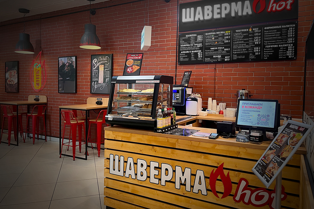 ШавермаHot – это всегда площадь от 70 квадратных метров и более 30 посадочных мест. Одна из фишек формата – обновленный дизайн интерьера, панорамные окна и просторные залы со стильным неоновым освещением.